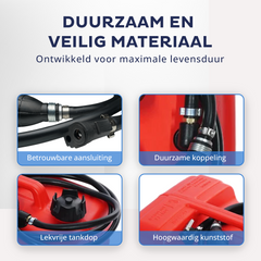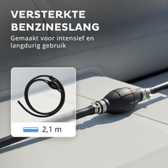 The gasoline hose in this set is reinforced and robust, suitable for intensive and long-term use. With a length of 2.1 meters, the hose offers enough space to safely store the tank in the boat.