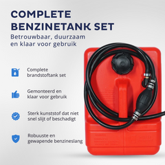 The fuel tank outboard motor set 11.3 liters is a complete fuel tank set that comes assembled and ready to use. This allows you to fill and connect the tank immediately. Thanks to the reinforced and secured critical points, the chance of leakage is minimized and the service life is extended.