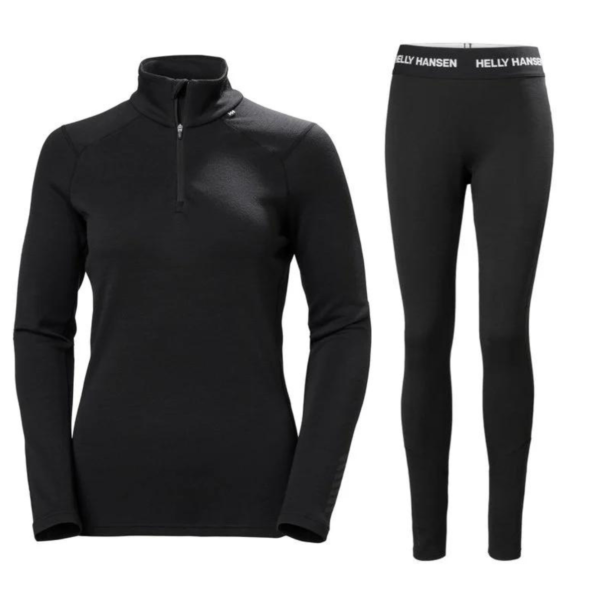 Helly Hansen Thermo Set Lifa Merino Midweight Halve Rits Dames Zwart is een comfortabele baselayer-combinatie voor koude en wisselvallige dagen op het water. Het shirt en de broek zijn opgebouwd uit Helly Hansen’s beproefde twee-laagse constructie: zachte Lifa-vezels direct op de huid voor snelle vochtafvoer en daarover merinowol voor warme, stabiele isolatie en natuurlijke geurbestendigheid. Het midweight-gevoel biedt precies die balans tussen bewegingsvrijheid en warmte die je zoekt onder een zeilpak, droogpak of waterdichte midlayer. De pasvorm is aansluitend zonder te knellen, met rek in alle richtingen, vlakke naden en strategische paneelopbouw zodat schuren onder schouderbanden, harnas of zwemvest tot een minimum wordt beperkt. De boord sluit prettig aan, de tailleband houdt de broek op zijn plek en de stof voelt soepel aan, ook wanneer je nat wordt door spray of zweet.